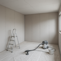 Préparation minutieuse des murs et plafonds : enduit, lissage, ponçage pour une base impeccable.